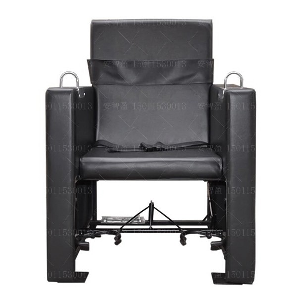 审讯椅手部采用U型锁约束,扶手部位宽度便于签字书写;xiong部及腰部以约束带束缚;腿部以环形脚踏锁。